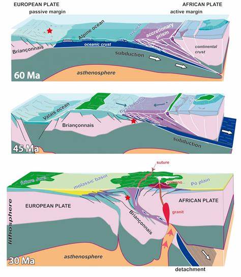 - 유럽 남부의 알프스 산맥은 유라시아판과 아프리카판의 충돌로 형성되었으며, 지질학적 활동이 계속 진행 중입니다.
